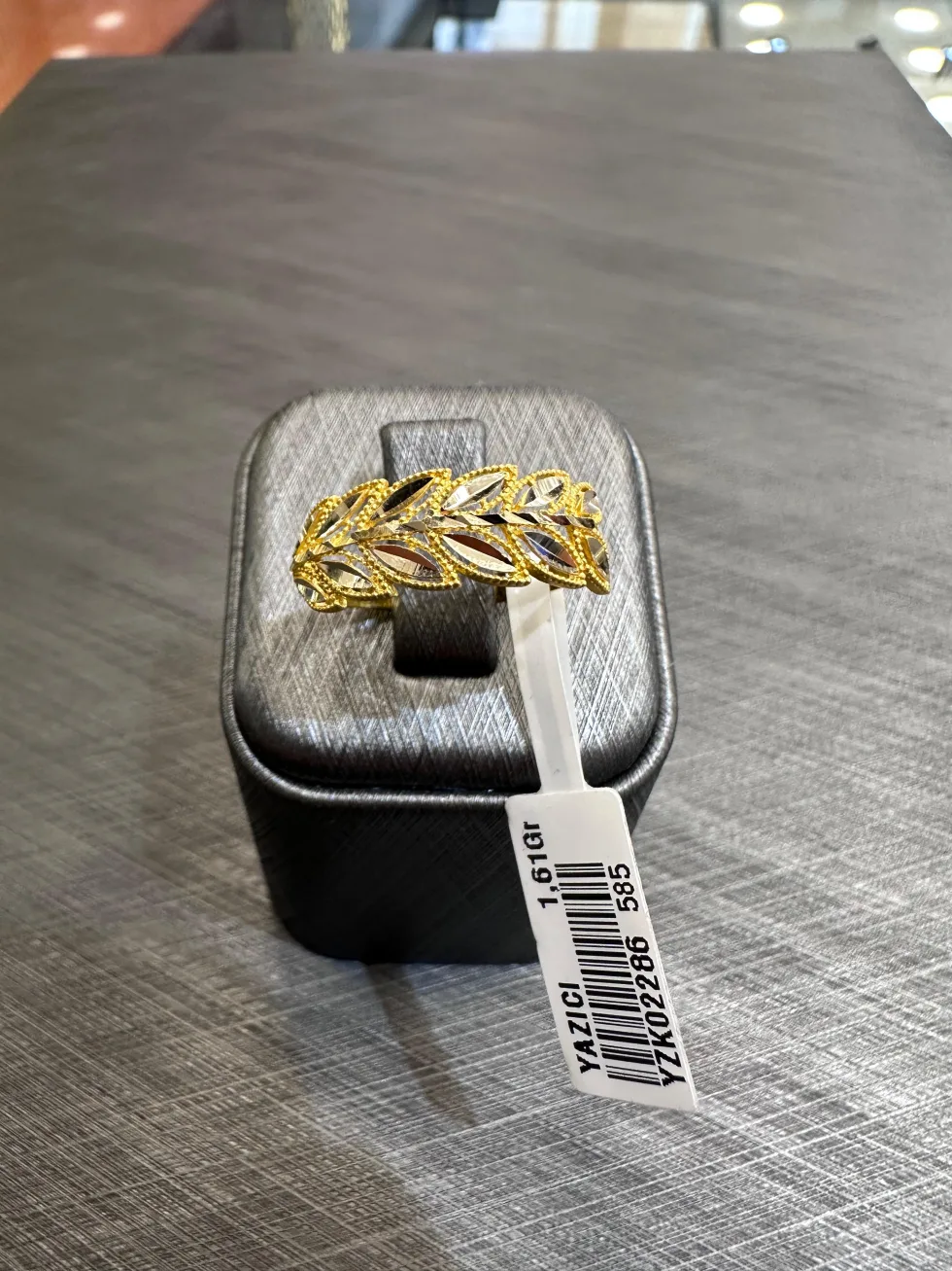 Şıklığı ve zarafeti bir araya getiren bu özel tasarım 14 ayar altın yüzük, modern ve klasik çizgilerin mükemmel uyumunu yansıtır. Yüzüğün üzerinde yer alan zarif yaprak motifleri ve iki renkli altın detayı, ürüne göz alıcı bir estetik kazandırır. Günlük kullanımda rahatlıkla tercih edilebileceği gibi özel günlerde de şıklığınızı tamamlayan zarif bir aksesuar olacaktır.