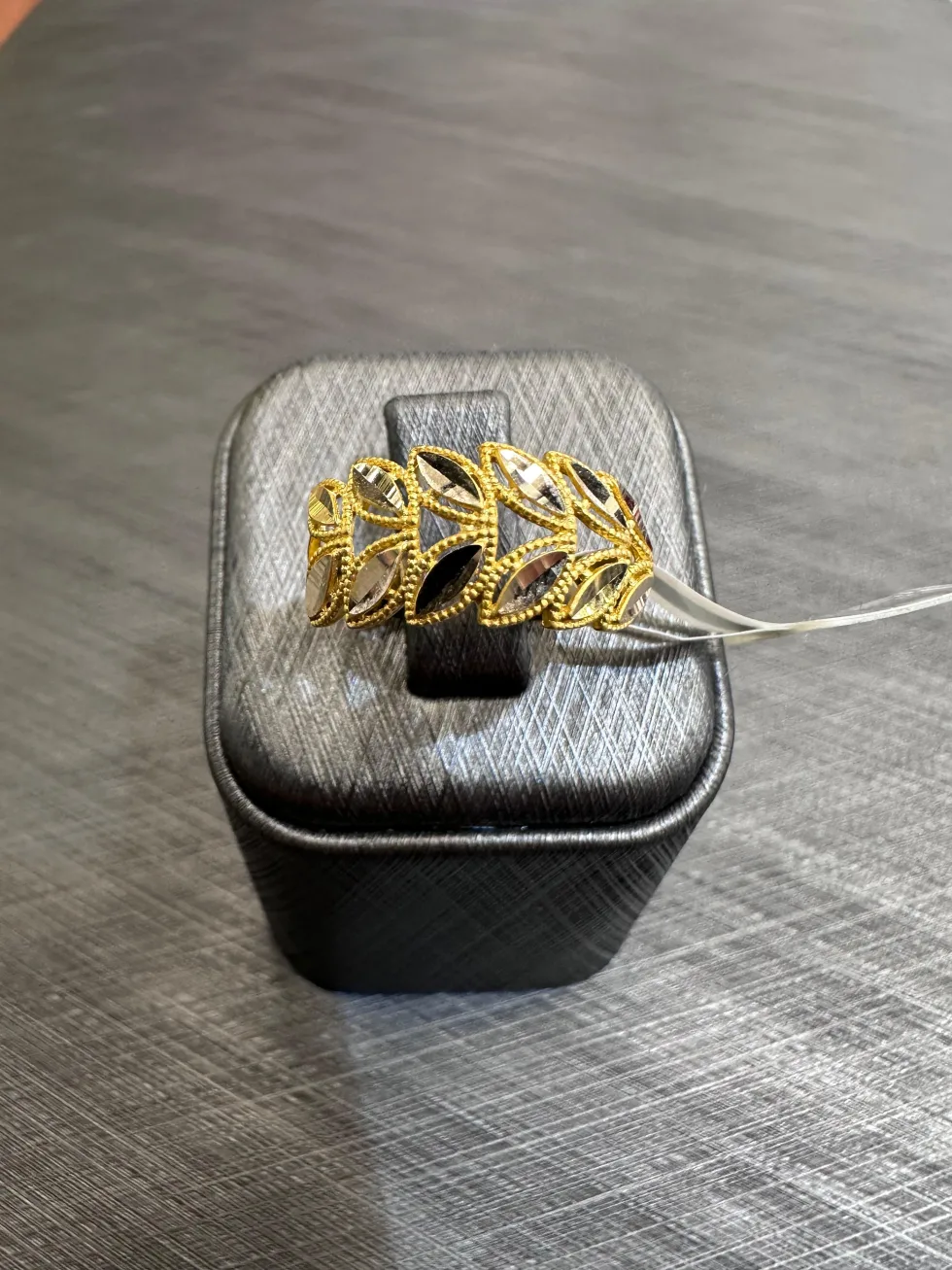 Zarif ve dikkat çekici tasarımıyla öne çıkan bu 14 ayar altın yüzük, yaprak formundan ilham alan estetik motifleri ve parlak kesimli yüzey detayları ile şık bir görünüm sunar. Yüzüğün üzerinde sıralanan yaprak şeklindeki altın motifler, ışığı farklı açılardan yansıtarak parmakta göz alıcı bir parlaklık oluşturur.